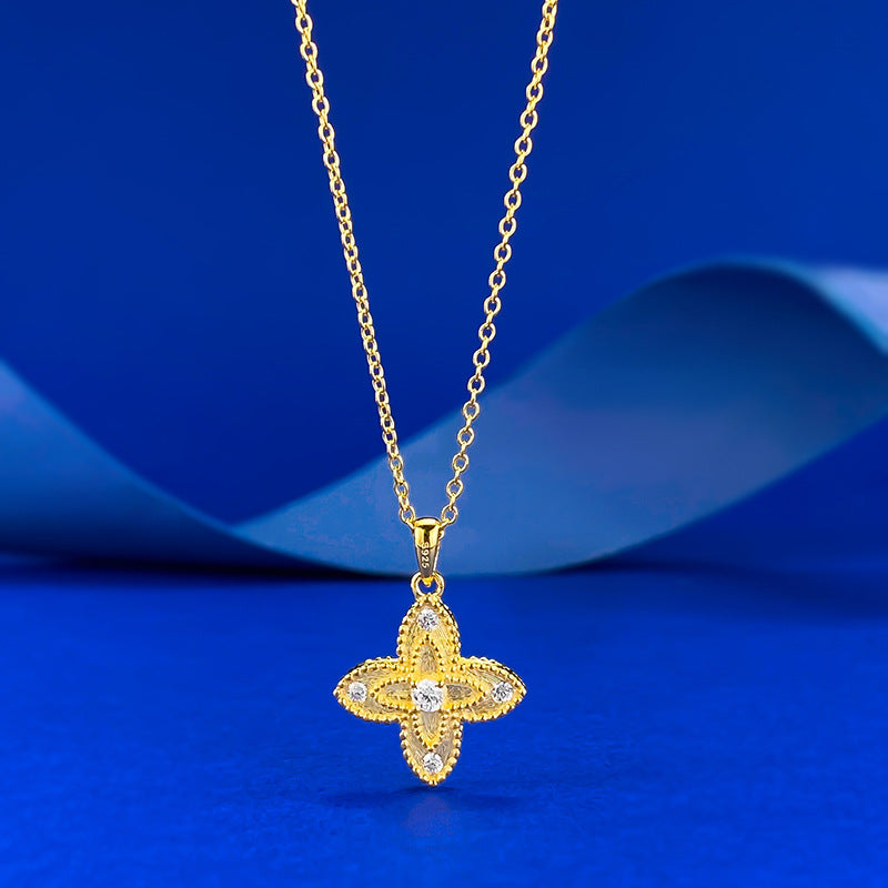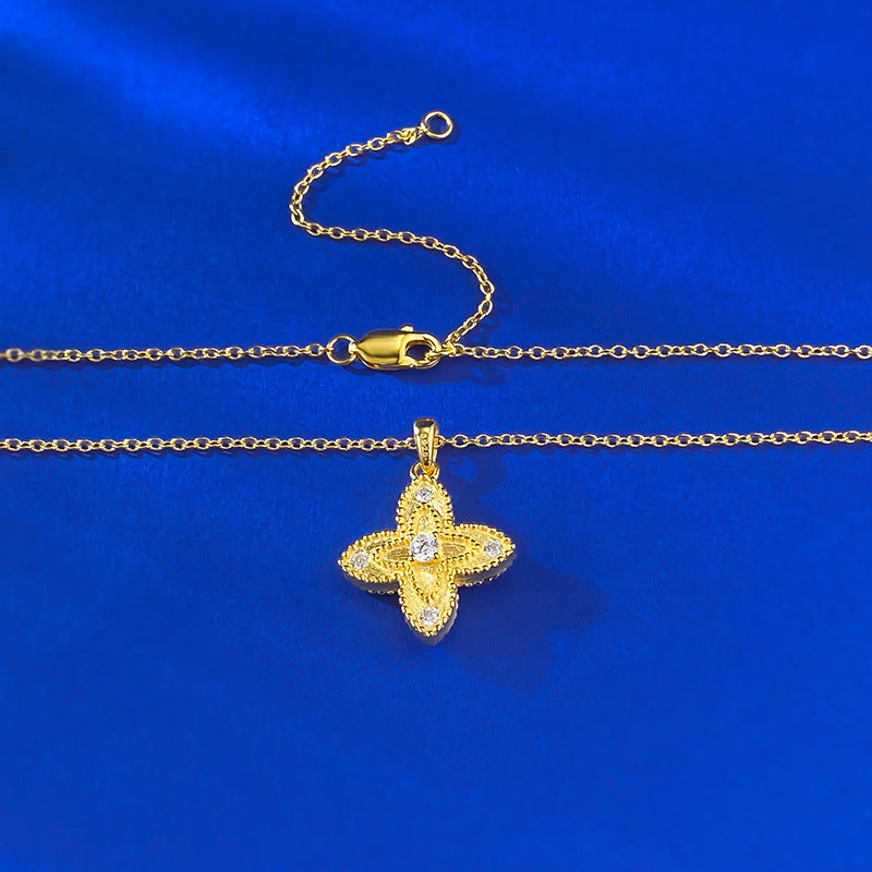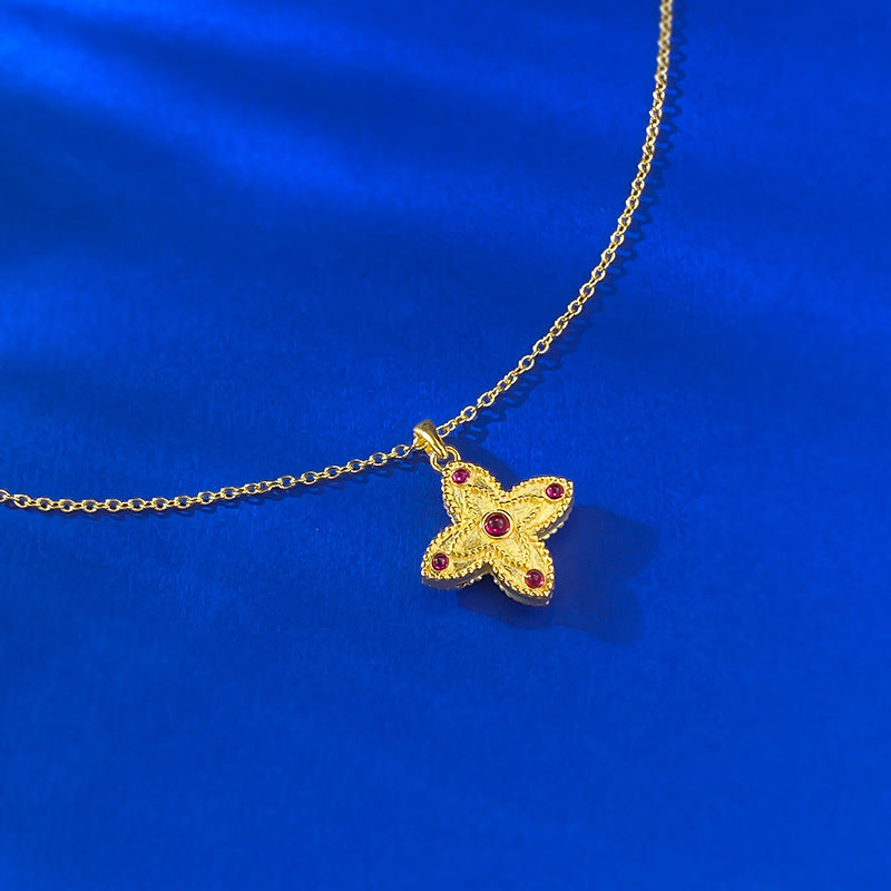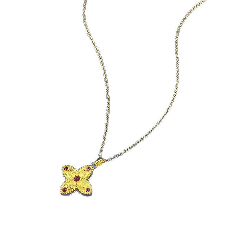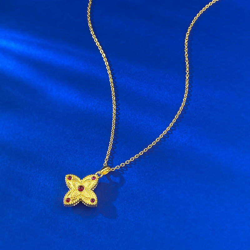 04/2025 Jewelry S925 silver four-leaf clover double-sided gold lace red diamond embellished necklace Chinese style adjustable chain